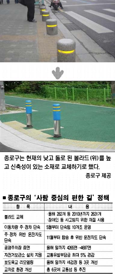 종로구는 이같은 논의를 거쳐 관할 도로에 설치된 ‘볼라드(차량 진입방지용 말뚝)’ 2631개를 2010년까지 하나도 빠짐없이 교체하기로 했다. 올해 말까지 종로를 중심으로 282개(10.7%)를 우선 바꾼다.