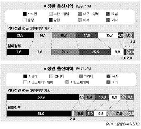하지만 장관 임명 사유는 정권별로 차이를 보였다. 문민정부에서는 장관 118명 가운데 정치적 보상 성격의 임명이 39명으로 가장 많았다. 출신지역, 출신학교 및 성별 균형을 맞추기 위한 ‘대표성 유지’가 임명사유인 경우도 12명이었다. 국민의 정부에서는 자민련과 연합정권인 탓에 연합정파를 고려한 장관이 97명 중 13명이었다.