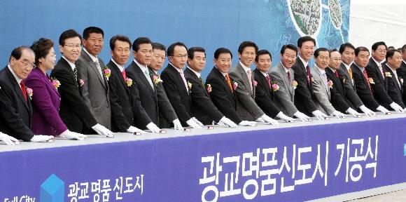 | 광교신도시 기공식이 5일 오전 김문수(왼쪽에서 네번째) 지사와 김용서 수원시장, 서정석 용인시장, 권재욱 경기지방공사 사장 등이 참석한 가운데 수원시 영통구 이의동 건설현장에서 열렸다. 경기도 제공 |