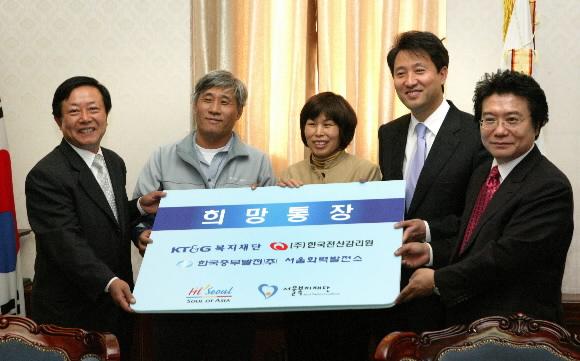 서울시 산하 서울복지재단은 저소득층 자산형성 프로그램인 ‘희망통장’ 사업을 7일부터 시작한다고 밝혔다.| 오세훈 서울시장이 7일 저소득층의 자산 형성을 도와주는 ‘희망통장’을 수혜자 부부에게 전달하고 있다. 왼쪽 두번째부터 수혜자 부부, 오 시장, 이성규 서울복지재단 대표. 서울시 제공 |