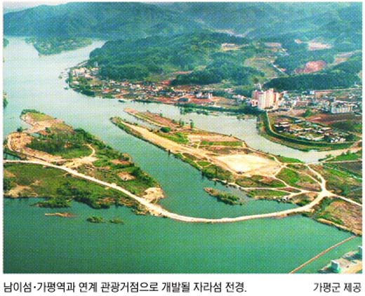 ‘북한강 르네상스 사업’은 남이섬과 자라섬, 경춘선 복선전철 가평 신역사를 삼각 구도로 묶어 연간 300만명의 관광객을 유치하는 관광거점 개발계획이다. 연간 160만명이 찾는 남이섬과 연계,2009년까지 420억원을 투입해 자라섬(65만 7900㎡) 내에 야외공연장·허브농원·연꽃단지·야영장 등을 갖춘 웰빙테마공원을 조성한다.2009년 완공예정인 가평 신역사 주변 60만㎡엔 실내외 공연장과 백화점박물관·아트공방 등 공연 및 공예예술 체험장을 조성한다는 구상이다.