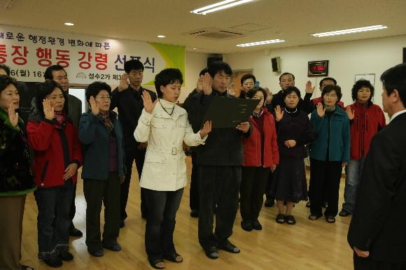 “공무원도 아닌 통장에게 무슨 행동강령이냐.”고 반문할 수 있지만 이날 통장들은 오른손을 들어 엄숙히 선서했다. 전국 지방자치단체 가운데 통장행동강령을 만든 것은 이번이 처음이다.