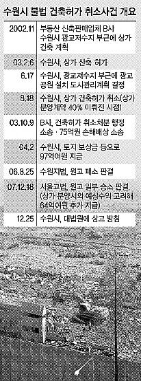 다만 B사가 건축허가를 신청할 때 건축법 요건을 충족하지 못해 건축허가 취소의 빌미를 제공한 점을 들어 수원시의 책임을 70%(64억여원)로 제한했다. 건축허가를 취소한 2003년 8월부터 올 12월까지 연 5%의 지연손해금도 물어야 하기 때문에 실제 손해 배상액은 78억여원이 된다. 수원시가 B사에 물게 된 금액은 토지 보상비 97억여원을 포함하면 175억원이 된다.