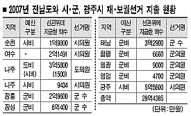 지난번 대통령 선거때 단체장 재·보궐 선거를 함께 치른 장흥군은 2억 8600만원, 해남군은 3억 2900만원, 장성군은 6억 400만원을 예비비로 선관위에 건네줬다. 또 시의원 선거에 순천시가 1억 9800만원, 여수시 2억 1491만원, 나주시 9434만원(추경 편성)을 지원했다.
