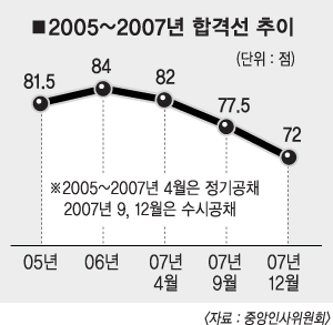 지난 14일 발표된 국세청 세무직 필기 시험의 합격선은 4회 연속 하락해 72점(일반인 기준)을 기록했다.2006년 정기 공채 때 84점보다는 무려 17%가 낮아진 것이다.