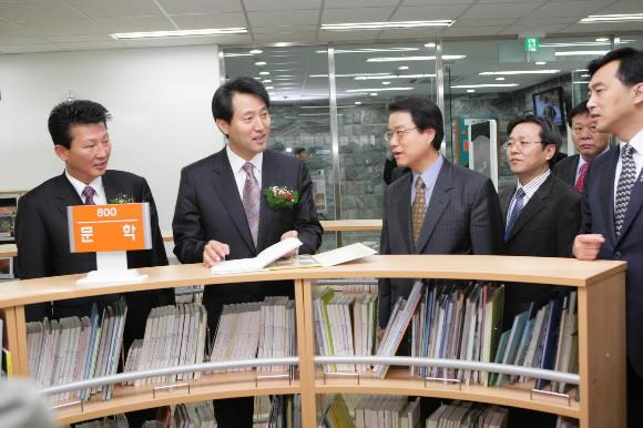 | 17일 문을 연 마포구 서강동 복합청사 5층 북카페를 찾은 오세훈(왼쪽에서 두번째) 서울시장과 신영섭(오른쪽 끝) 마포구청장 등이 이영희(가운데) 마포구 문화체육과장으로부터 장서보유 현황 등에 관한 설명을 듣고 있다. 마포구 제공 |