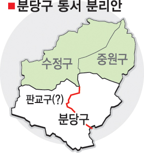 22일 성남시에 따르면 분구를 앞두고 지난해 9월 한국경제조사연구원에 분구 타당성 및 행정구역 조정에 관한 연구용역을 의뢰했다. 분당구의 인구는 43만 5144명으로 판교 입주(8만 7795명)가 끝날 경우 50만명이 넘어서 분구조건을 갖추게 된다. 용역결과에서 신설구 명칭은 판교구(가칭), 행정구역조정은 동·서 분리안이 제시됐다. 이 안이 확정되면 분당구 19개 동 가운데 정자·금곡·구미·판교·운중동 등 8개 동은 신설되는 판교구에 편입되고 분당·수내·서현·이매·야탑동 등 11개 동은 분당구에 남는다. 시는 올 4월 총선이 끝난 뒤 행자부에 분구안 승인을 요청할 계획이다.