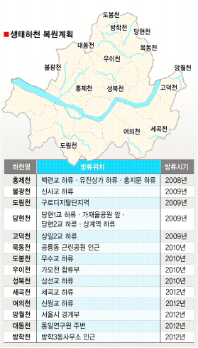 올 6월까지 홍제천에 한강물(4만 3000t)을 끌어들여 방류하고, 내년에는 불광천, 도림천, 당현천, 고덕천을,2010년에는 성북천, 묵동천, 도봉천, 우이천을,2012년까지는 세곡천, 여의천, 대동천, 망월천, 방학천을 각각 복원할 계획이다. 새롭게 복원한 하천에는 한강, 중랑천 등에서 취수한 원수, 물재생센터의 고도처리수 및 지하철역의 지하수를 방류한다. 방류 지점을 다양화해 항상 비슷한 수위를 유지할 수 있게 했다.