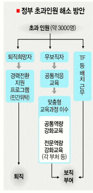 지침에 따르면 보직을 받지 못한 초과현원들 중 일부는 ▲부처별 규제개혁·업무혁신 TF 배치 ▲대구 세계육상선수권(2011년), 여수 세계박람회(2012년)등 국가적 국제행사 준비 및 지원 등에 투입된다. 나머지 상당수는 행정안전부가 마련한 맞춤형 교육과정을 이수한 뒤 보직을 부여받는다.