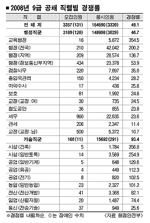 이번 시험에는 3357명 모집에 총 16만 4690명이 원서를 제출, 평균 49.1대1의 경쟁률을 보였다. 응시연령은 확대됐지만 공무원 고용 불안으로 응시생은 지난해보다 2만 2000명이 줄었다. 행정직에는 14만 8998명이 응시해 46.7대1, 기술직은 1만 5692명이 원서를 내 93.4대1의 경쟁률을 나타냈다.
