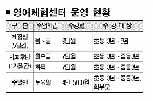 ‘묘곡초 영어체험센터’는 시설투자 비용이 적다 보니 수강료도 저렴하다. 초·중학생을 대상으로 주 5일 정규 프로그램 가격이 9만원에 불과하다.5일간 총 35시간을 영어에 투자한다. 주변 사설 학원이 이런 프로그램에 20만∼30만원을 받는 것을 감안하면 반값이 안 된다. 하루 2시간씩 한 달간 진행하는 ‘방과후반’의 가격은 이보다 더 싼 7만원이다.