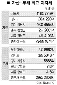 부채규모가 가장 큰 지자체는 경기도였다. 총 3조 5048억원으로 지자체 평균 부채규모인 1189억원보다 30배가 많았다. 행안부 관계자는 “지역개발채권 발행액이 많기 때문”이라고 밝혔다.