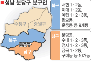 13일 성남시와 판교입주예정자연합회에 따르면 시는 분당을 동·서로 나누는 처음의 분구계획안을 뒤엎고 남·북으로 나누는 방안을 마련해 최근 시의회에 의견청취안으로 제출했다.