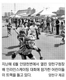 오는 8일 ‘제3회 양천구청장배 국민생활체육 전국 인라인스케이팅 대회’를 개최한다. 전국의 인라이너들이 안양천 목동교 인라인스케이트장에 모여 유치부 트랙경기를 시작으로 60세 이상의 골든부까지 다양한 부문의 경기가 열린다. 오전 10시 개회식과 인라인 슬라럼 시범에 이어 부문별로 예선 및 결승 경기를 치른다. 문화체육과 2620-3417.