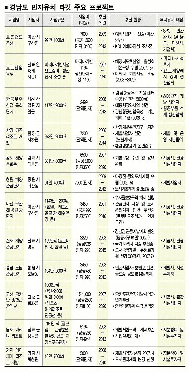또 동북아 관광허브 도약을 위해 추진하는 창원·통영·진해·고성·남해·거제 등의 해양관광·레저단지 조성 사업과 함양 다곡리조트, 산청 한방의료 휴양지 조성 등의 내륙·산악형 복합단지 개발사업 등도 타깃 프로젝트 사업으로 선정했다.