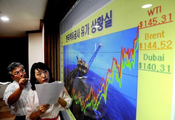 | 중동 두바이유와 미국 서부 텍사스산 원유 등 유가가 연일 사상 최고치를 기록하는 가운데 한국석유공사 직원들이 4일 경기 안양시에 있는 본사 상황실에서 유가추이를 점검하고 있다. 안양 이호정기자 hojeong@seoul.co.kr |