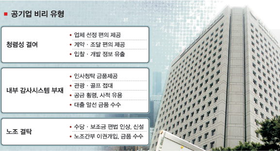 참여정부는 여러 차례 공기업 사정을 단행했다. 불합리한 제도를 바꾸고 비리 직원에 일벌백계 징계를 내리면서 비리가 줄었다고는 하지만 뿌리는 뽑지 못했다. 공기업 사정을 하고 있는 이명박 정부가 비리를 근절할 수 있을지는 미지수다.