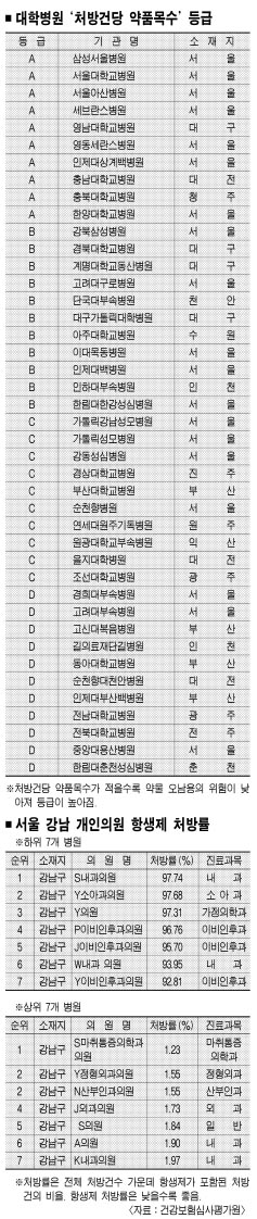 심평원은 이번 평가에서 전국 2만 5871개 의료기관을 대상으로 처방건당 약 품목수를 평가해 A∼D까지 4등급으로 나눠 결과를 공개했다.42곳의 대학병원 가운데서 삼성서울병원은 호흡기계질환의 처방건당 약품수가 평균 2.25개로 A등급을 받았다. 반면 일부 대학병원들은 평균 4.4∼4.5개를 웃도는 처방을 해 D등급을 받았다.
