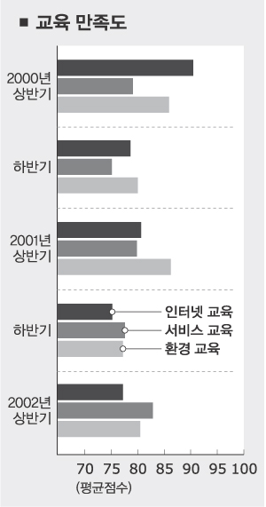 (1) 2002년 상반기 교육만족도의 평균은 2001년 하반기 조사에 비해 향상됐으나, 인터넷 교육은 다른 교육에 비해 상대적으로 만족도가 낮다.