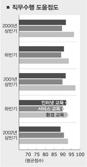 (2) 2002년 상반기의 설문조사 결과, 교육내용이 직무수행에 도움이 된다는 응답이 같은 기간의 교육만족도에 비해 평균적으로 높은 점수를 받았다.