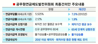 건의안에 따르면 현행 과세소득 기준 5.525%인 부담률이 2012년 7%까지 단계적으로 인상된다. 이 경우 부담률은 지금보다 27% 증가한다. 반면 지급률은 현행 2.12%에서 1.9%로 하향 조정돼 연금액은 최대 25%까지 줄어든다.