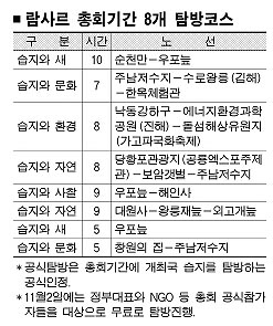 생태관광은 공식 생태탐방과 관광프로그램으로 나눠, 생태탐방은 11월2일 내륙·연안·산지습지와 전통문화·전통사찰·환경체험 등 8개 코스에서 진행된다.