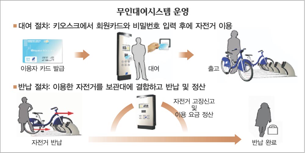 이번에 도입될 시스템은 총 250여개의 거점에 고급자전거 3000여대를 운영하는 것으로 아파트 단지, 주거지역, 지하철역, 학교, 대형쇼핑센터, 주요 간선도로 주변 등에 골고루 설치돼 누구나 손쉽게 자전거를 이용할 수 있게 된다.30분 무료운행 후 초과시간은 약간의 이용료를 받을 계획이다.