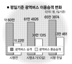 서울시는 수도권 광역버스의 교통카드 자료를 분석한 결과 지난 한달 사이 광역버스 이용객이 하루 평균 약 60만명에서 65만 3874명으로 5만여명(9%)이나 증가한 것으로 집계됐다고 19일 밝혔다. 환승객 수도 한 달 전 약 22만명에서 11만여명이 늘어난 33만 461명에 이르는 등 50%나 증가한 것으로 나타났다.