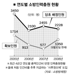 20일 소방방재청의 ‘연도별 소방인력충원 현황’에 따르면 2005~07년 총액인건비를 반영한 배정인원은 모두 8005명이었지만, 실제 충원인원은 3204명에 불과한 것으로 밝혀졌다.