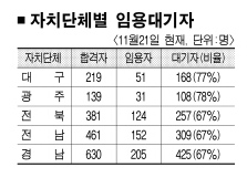 전북도의 경우 올 7월24일 도청과 14개 시·군에서 259명을 선발했으나 21일 현재 135명이 임용대기 상태다. 더구나 이달 13일 122명을 추가로 선발해 임용대기 인원은 사실상 257명에 이른다.