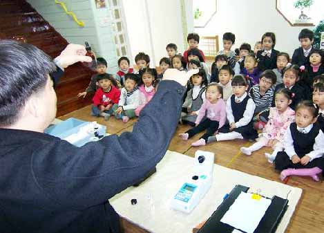 마술처럼 물색이 연초록으로 변했다.그는 “이것은 물의 산성도(pH)를 측정하는 건데 아주 정상이에요.”라며 탁도,잔류염소,철,구리 등 수질검사를 차례로 진행했다.시간은 불과 10분가량 걸렸다.아이들이 초롱초롱한 눈으로 지켜봤다.