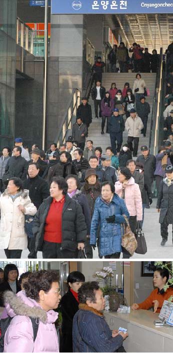 | 지난 3일 온천욕을 즐기기 위해 수도권전철을 타고온 관광객들이 온양온천역을 빠져 나오고 있다(위쪽 사진). 같은 날 수도권에서 내려온 온천관광객들이 역 인근 신천탕 입구에 줄지어 서 있다. |