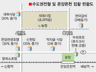 ‘전철이 온양온천을 되살리나.’충남 아산시 온양온천이 수도권전철 개통으로 아연 활기를 띠고 있다. 신혼여행과 수학여행지로 최고의 호황을 누리다 침체를 거듭한지 30년만에 찾아온 ‘제2의 전성기’에 시민들은 흥분하고 있다. 자치단체의 의욕도 넘쳐나고 있다. 아직은 노인들이 주 고객이지만, 하루빨리 가족과 청소년들에게도 인기 있는 온천관광지로 키워 옛 영화를 되찾겠다는 각오다.