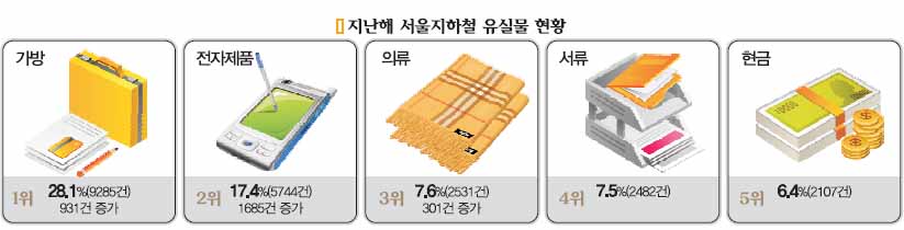 흔히 전동차 선반 위에 가방을 올려 놓았다가 깜박 잊고 내리는 바람에 빚어지는 일이다. 그 다음이 휴대전화, MP3 등 전자제품 17.4%(5744건), 의류 7.6%(2531건), 서류 7.5%(2482건) 등 순이다. 이어 손지갑에 든 현금 6.4%(2107건), 시계 등 귀금속 0.2%(52건) 이다. 휴대전화는 전동차 의자와 등받이 사이의 빈틈에 끼어 있는 사례가 많다. 잃어 버린 현금의 총액은 1억 7200만원에 이른다.