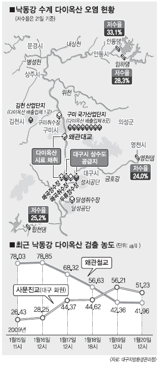 여기에다 최근 강수량 부족과 낮은 기온 등 기상현상도 이번 사태를 악화시켰다. 비가 오지 않은 탓에 낙동강으로 흘러드는 하루 유량은 예년의 450만t에서 올들어 350만t으로 급감했다. 또 안동댐, 임하댐 등 낙동강 수계 댐의 저수량도 20~30%로 낮아져 물을 마음대로 방류할 수 없었다.