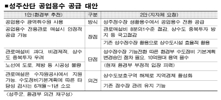 성주군 관계자는 “이런 상황에서 산단 조성시 성주정수장을 공업용수 공급 정수장으로 기능 전환을 한다면 관로매설 공사비 등 예산 절감은 물론 운용면에서도 훨씬 효율적일 것”이라고 강조했다. 용도가 생활용수에서 공업용수로 전환되면 상수도로부터 반경 10㎞내 개발이 제한되는 상수도보호구역도 풀리게 된다. 이럴 경우 위치상 성주읍의 정중앙에 있는 정수장으로 인해 수십년간 묶여 있던 지역경제 개발도 가능하게 된다. 원주 문막읍 문막제2정수장은 2006년 생활용수에서 공업용수용으로 전환돼 주민들의 재산권이 크게 확대됐다.