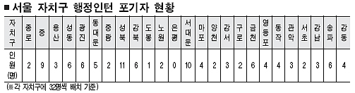 행정 인턴은 지난달 15일 전공 분야와 자격증 여부, 어학 수준을 살려 정식 채용에 도움을 준다는 취지에서 미취업 청년 1만 900명을 선발했다. 서울시는 1000명을 뽑아 800명을 25개 자치구에 32명씩 배치했다. 지원자 중 884명이 서울대, 연세대, 고려대 등 서울지역 대학을 나왔다. 28명은 외국 대학 졸업생이었다.