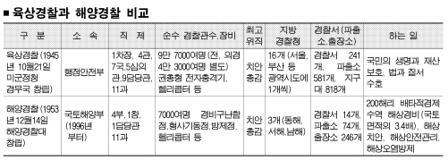 일부 경찰관은 “정부가 부처를 기능별로 개편하고 있는 실정에서 육경과 해경은 통합돼야 하며, 해경이 하는 방제 업무도 다른 전문기관으로 넘겨주면 된다.”고 주장했다. 최응렬(경찰학) 동국대 경찰행정학과 교수는 “사실상 정치적 논리로 정부가 해양수산부를 만들면서 해양경찰이 분리됐고 경찰 고유업무가 육상이나 해상이나 다를 게 없기 때문에 하루빨리 두 조직을 합쳐야 한다.”고 강조했다.