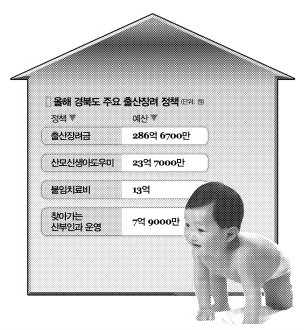 도 등은 올해 ▲다복가정 희망카드(다자녀 가정 우대제) 활성화 ▲산모 신생아 도우미 지원 ▲불임부부 시술지원사업 확대(지난해 1인당 2회 540만원→1인당 3회 810만원) ▲찾아가는 산부인과 운영 등을 펼친다. 특히 출산 가정의 양육부담을 덜기 위해 지난해 월 10만원씩 지급하던 셋째아 이상 출산 장려금을 올해는 둘째아 이상에게 월 10만원씩 지급하기로 했다. 이를 위해 도는 132억원을, 시·군은 154억 6700만원의 출산장려금을 책정했다.