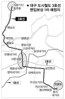 대구도시철도 3호선 건설의 시동이 걸렸다.대구도시철도건설본부는 11일 대구도시철도 3호선 편입부지 보상에 들어갔다고 밝혔다. 내달 20일까지 시행되는 1차 보상에는 중구 계명대네거리~달성네거리 달성로와 북구 동호동 서리못 일원 차량기지 예정지, 수성구 범물동 범안로 입구 주박기지 예정지 등 3곳으로 222개 필지, 12만 2083㎡의 토지와 건물 82개 동이다.
