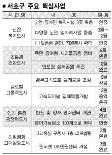 “차원이 다른 복지서비스를 제공해 구민 행복지수를 한단계 끌어올리겠습니다.”박성중 서울 서초구청장은 11일 올해의 화두를 ‘복지 인프라 선진화’라고 소개했다. 앞서가는 시책과 차별화된 인프라 구축으로 복지행정의 선진화를 보여주겠다는 복안이다. 이를 위해 홀몸노인 원격보호시스템을 확대하는 등 사회안전망을 강화하고 소외계층을 위한 복지시설을 늘려 이웃사랑을 실천한다는 방침이다.