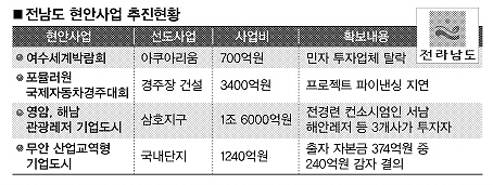 또 2010~2016년 영암에서 열리는 포뮬러1(F1) 국제자동차경주대회는 경주장을 건설(공정률 43%)하고 있으나 시행사들이 건설비 3400억원을 은행에서 빌리지 못해 발을 구르고 있다. 자금대출의 신호탄이 될 F1 지원특별법은 전남도가 발이 닳도록 국회를 찾아가 호소했지만, 해를 넘겨 계류 중이다. 도는 이달 안에 대출을 받기 위해 출자사들과 금융협약을 맺을 계획이지만 투자 이익 실현방안에 의견이 엇갈려 절충하고 있다.