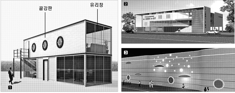 | 서울시가 제시한 건설현장 관련 표준 디자인 모델들. 가설사무실은 2층이면서도 충분한 전망 공간(①)을 확보해 시각적 개방성을 높였고, 전면부에 목재판을 배치(②)해 고급스러운 느낌을 살렸다. 또 가림막(③)에도 LED 조명을 설치해 예술성과 정보전달 기능을 갖췄다. 서울시 제공 |