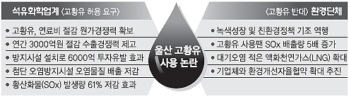 석유화학업계는 현재의 저황유(황 함유량 0.3% 이하) 연료를 고황유로 전환하면 연간 3000억원의 비용절감을 가져올 뿐 아니라 최첨단 오염방지시설 설치로 6000억원의 투자효과도 기대된다고 밝혔다. 업계는 지금의 경제위기를 돌파하기 위해 전체 생산비용의 45%인 연료비를 줄여 원가경쟁력을 높이는 게 유일한 대안이라고 주장했다.
