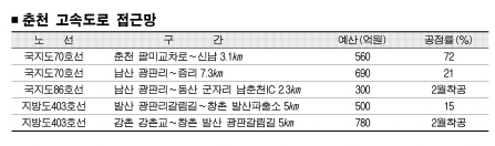 국지도 70호선 춘천∼신남 구간 3.1㎞, 남산∼춘천 구간 7.4㎞, 지방도 403호선 창촌∼발산 구간 5㎞ 등 3개 노선 확장 공사도 모두 시작됐다.