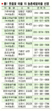 “봄을 느낄 수 있는 우리 마을로 오세요.” 경기도는 31일 온가족이 즐길 수 있는 농촌체험마을 15곳을 선정, 발표했다. 각 농촌체험마을에서는 산과 들을 거닐며 갓 돋아난 고사리와 돌미나리 등 봄나물을 채취할 수도 있고 치즈 만들기, 씨뿌리기, 전통주 만들기, 송편만들기도 체험할 수 있다. 진달래꽃 화전만들기에서 나룻배 타기까지 경험할 수 있다. 체험마을별 각종 체험프로그램에 참여하는 데에는 1인당 2만원가량의 비용이 든다. 경기도농촌체험관광 사이트(//kgtour.kr)에서 마을별 체험프로그램과 위치 등을 자세히 안내하고 있다.