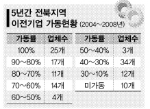 6일 전북도에 따르면 최근 5년 동안 전북으로 이전한 기업은 345개이다. 이 가운데 가동 중인 기업은 1월 말 현재 130개이고 20개 업체는 공장을 짓고 있다. 나머지 195개 업체는 부지만 매입해 놓은 상태다. 부지를 매입한 뒤 3년 이상 공장을 설립하지 않아 환수조치를 당한 기업도 11개나 된다. 기업들이 공장 설립을 늦추는 것은 경기침체로 투자 전망이 흐려 속도조절을 하고 있기 때문인 것으로 알려졌다. 산업집적화에 관한 법률은 기업들이 부지를 매입 한 후 3년 동안 공장을 설립하지 않으며 환수 가능하도록 규정한다.