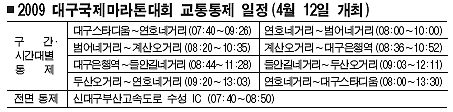 대구시가 8일 열릴 2009년 대구국제마라톤대회 교통통제 대책을 마련했다.이번 대회는 2011년 대구세계육상선수권대회와 동일한 코스에서 열리며, 달구벌대로와 수성로·들안길·동대구로 등이 주요 통제 구간이다.