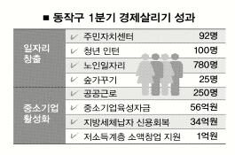 서울 동작구의 지역 경제살리기 사업들이 만족할 만한 성과를 내고 있다. 동작구는 지난달 말까지 4개월 동안 주민 2284명에게 새 일자리를 제공했다고 7일 밝혔다. 또 복지 분야에서도 저소득층 지원 등 28개 사업을 통해 총 3만 7000여가구에 혜택을 주었다.김우중 구청장은 “올해 경제활성화 대책은 일자리 창출과 어려운 이웃을 돕는 복지분야에 집중하고 있다.”면서 “더 많은 일자리를 만들어 어려움에 처한 주민들과 지역경제에 활력을 불어넣겠다.”고 말했다.