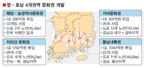 전남·북과 경남에 걸쳐 있는 지리산문화권 사업에는 고유문화 개발 28개 사업과 도로 16개 노선 91.2㎞ 개설 등에 1조 5192억원이 투입된다.